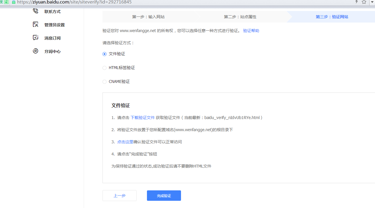 第三步:我选择的是文件认证,先在站长工具平台下载文件,然后登陆FTP,在网站的根目录上传文件后点击完成认证就添加站点成功了。