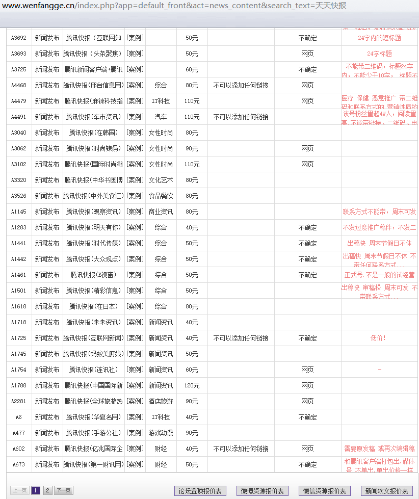 文芳阁天天快报部分发稿资源价格