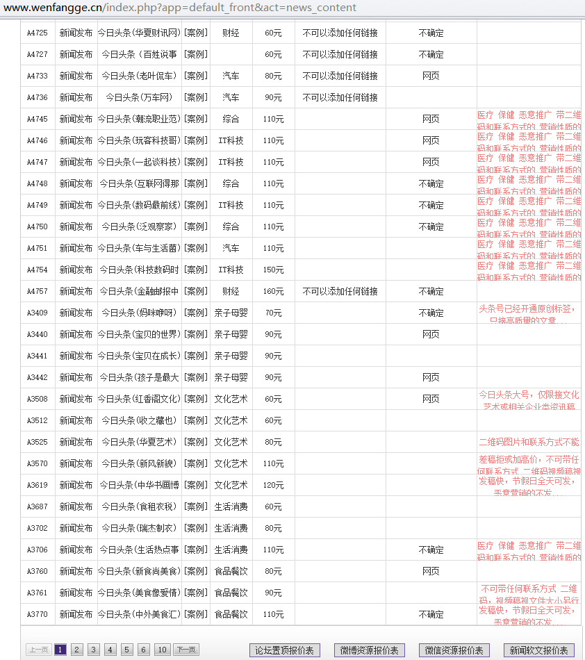 下面是文芳阁部分今日头条发稿资源价格: